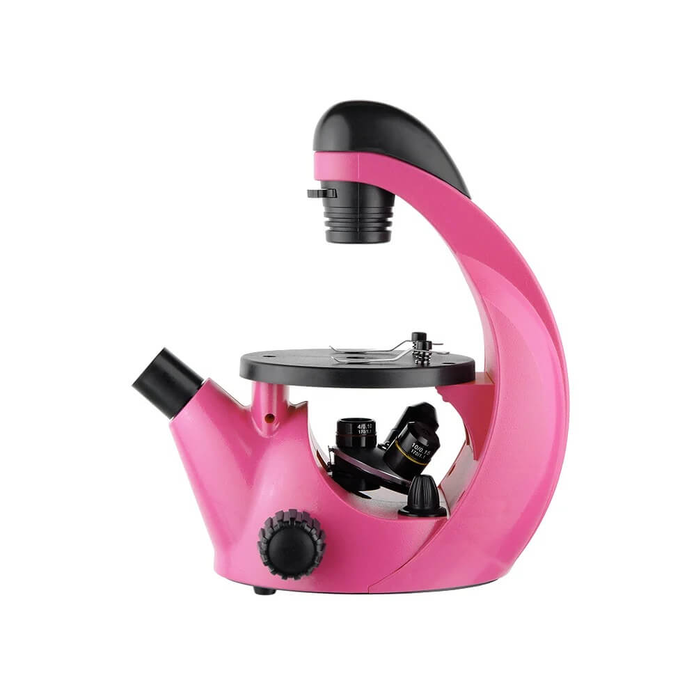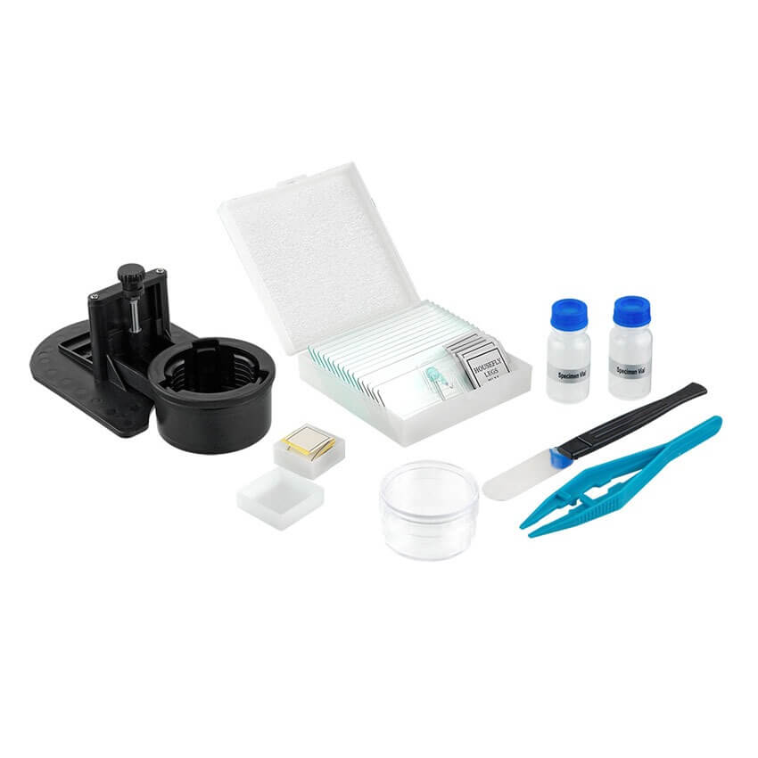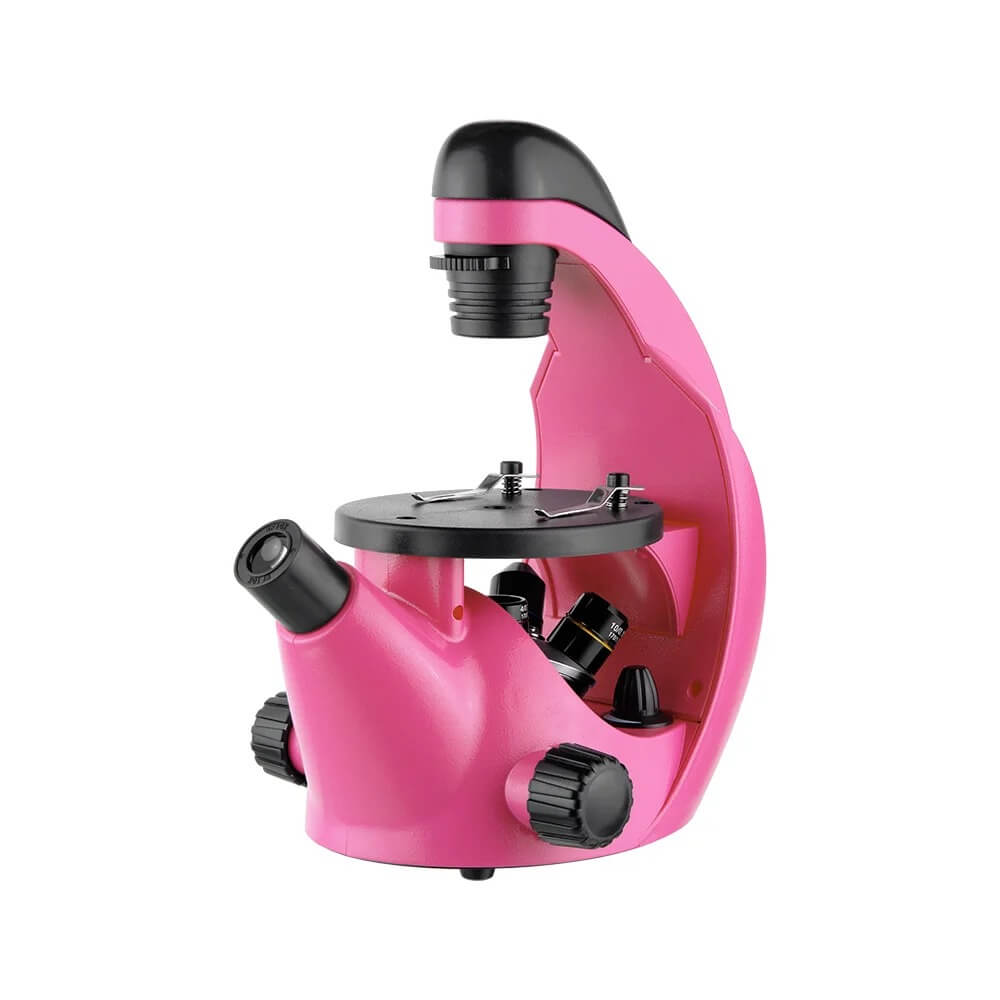 Лабораторное оборудование для проведения опытов. Конструкция прибора имеет перевернутую оптику: три увеличительных объектива расположены под предметным столиком, а осветитель – сверху. На столике предусмотрены клеммы с пружинным механизмом, которые дают возможность зафиксировать объекты исследования на стекле. Микроскоп позволяет наблюдать за микроорганизмами, которые выращиваются в специальной посуде. Питается устройство от 3 батареек формата АА. В комплектацию входят набор из 15 образцов, чистые наклейки, скальпель, готовые реактивы, покровные стекла, пинцет, мензурка.